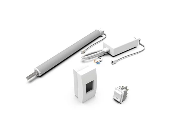 24V tubular motor (installed in the fly screen roller box) with transformer integrated in the control switch (complete with plate and external mask).